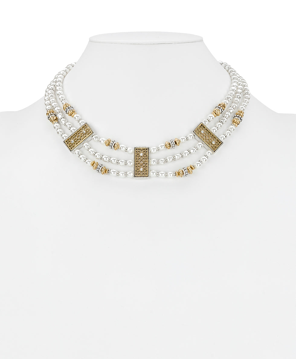 Lustrous pearl beads and antique-inspired metal accents come together in this elegant layered necklace. Intricate rectangular spacers add texture and vintage charm. while the gold details bring a touch of contrast. Designed to make a refined statement. this piece effortlessly elevates both everyday looks and special occasion ensembles.