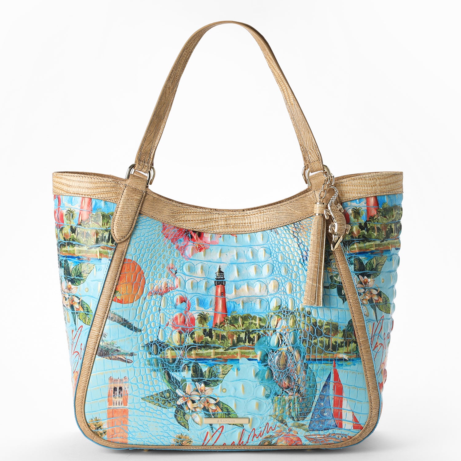 Featured in Multi Banner. a print inspired by adventure with nods to our living legacy. This multi-Melbourne collection features a vibrant incredibly playful print that depicts iconic scenes from each state with a Brahmin boutique. The light neutral Sandstorm trim brings in an element of versatility. The croc charm features Swarovski® crystal accents with a leather inlay in a light neutral lizard leather. Made with genuine leather.