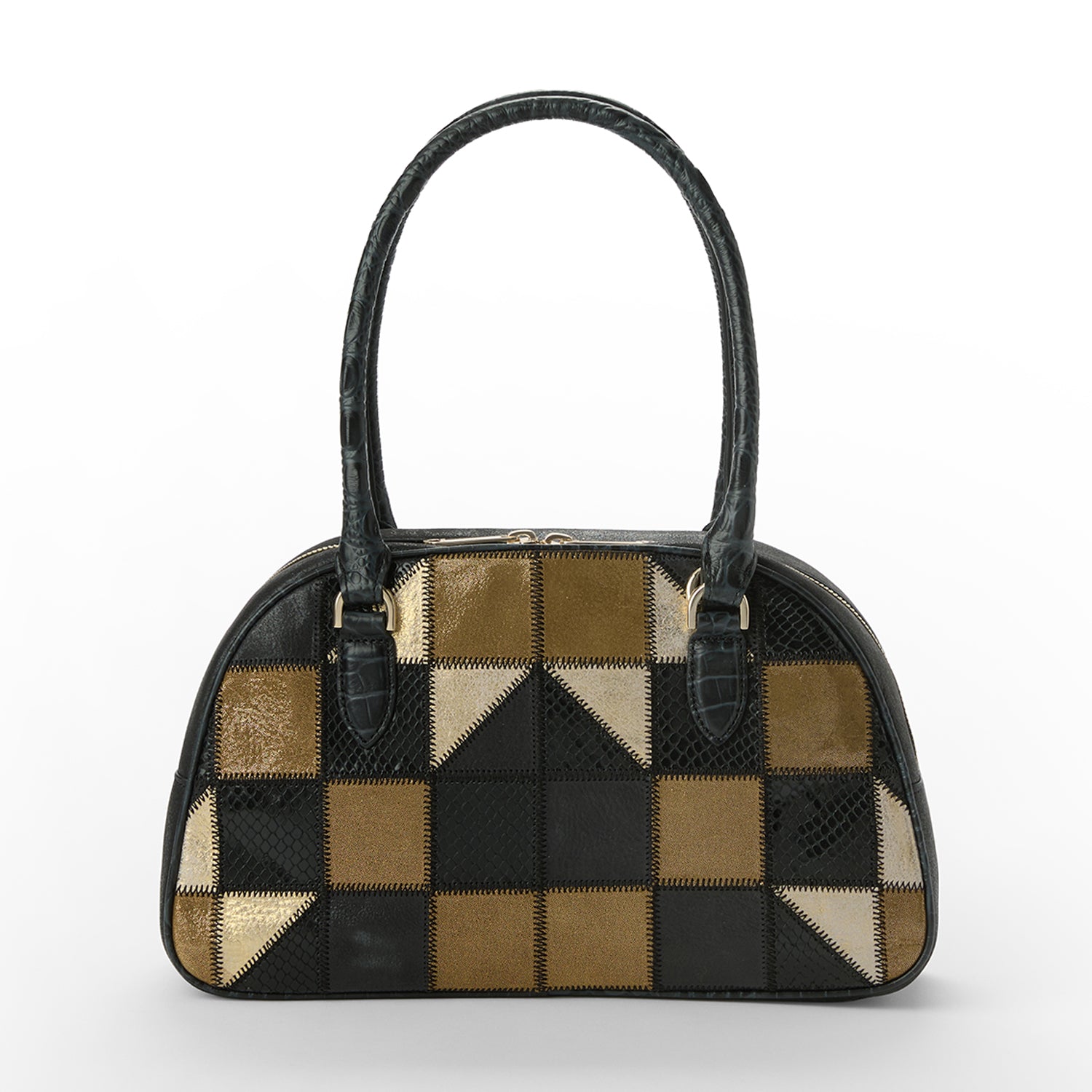 Featured in Black Fete. a Premier collection that showcases the best of our elevated craftsmanship. With a rich and varied history. patchwork is. above all else. a testament to craftsmanship and pays homage to all the artisans who came before us. This timeless technique has evolved through the decades – ours is effortlessly modern with an eye-catching infusion of bronze and light gold metallic in the softest suede. These luxe leathers come together in harmony with smooth black leather and a soft black snake. The handles are designed with comfort in mind using our lightweight and casual Alden Road leather. The back is crafted with smooth black leather. Made with genuine leather.