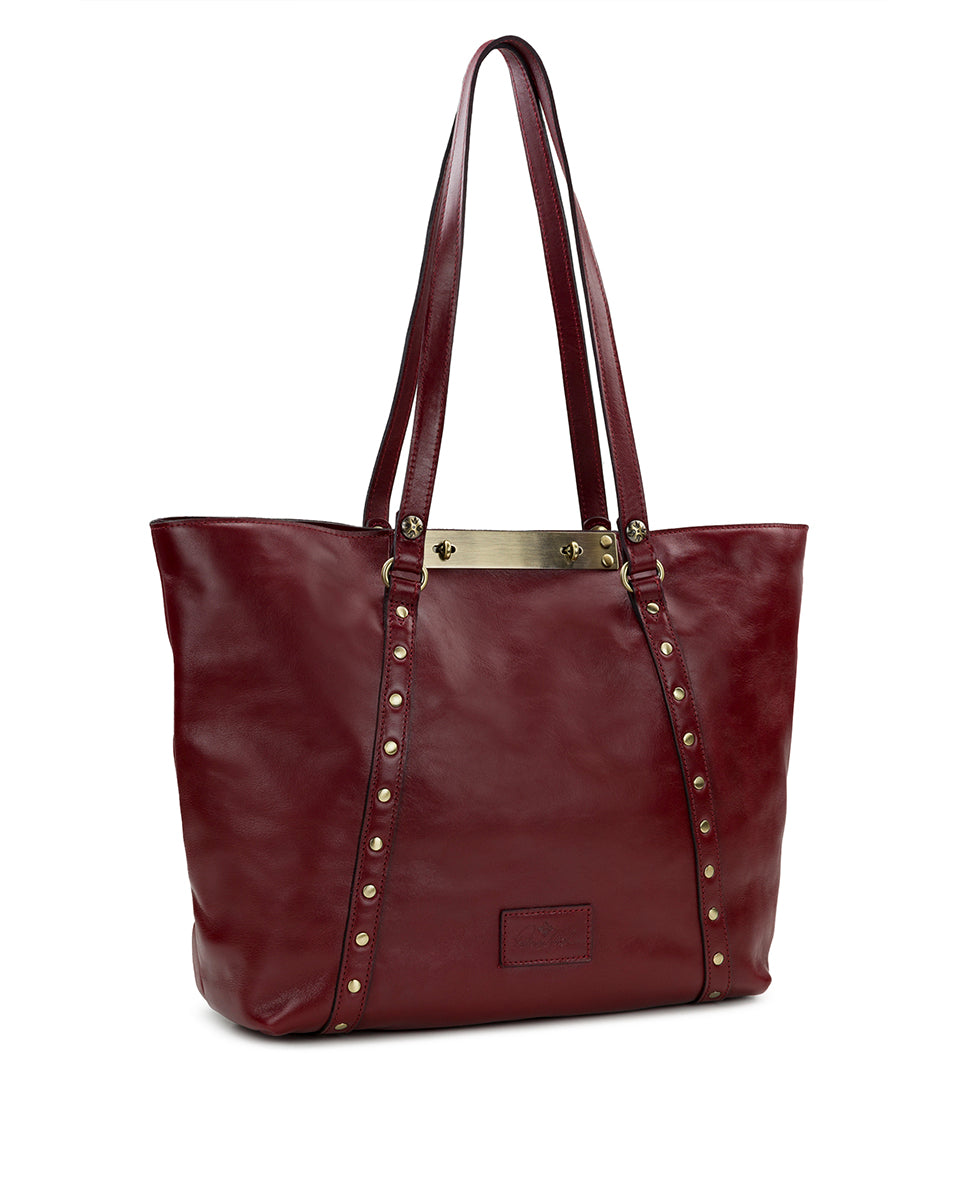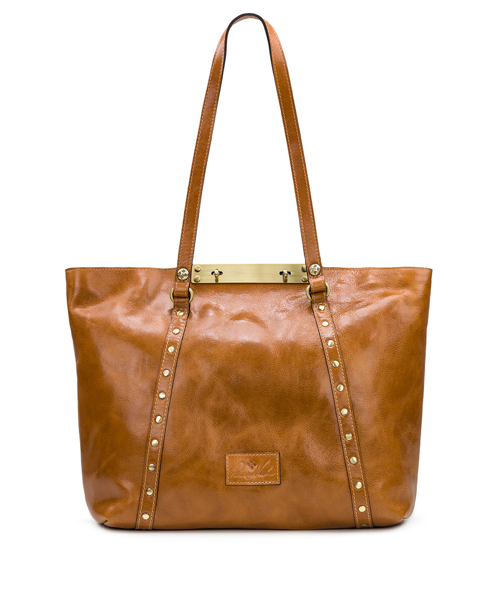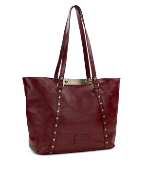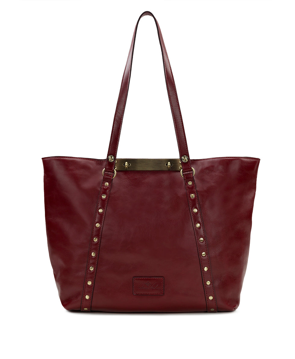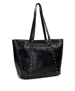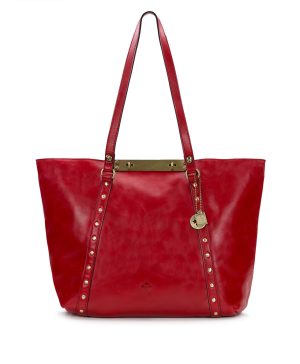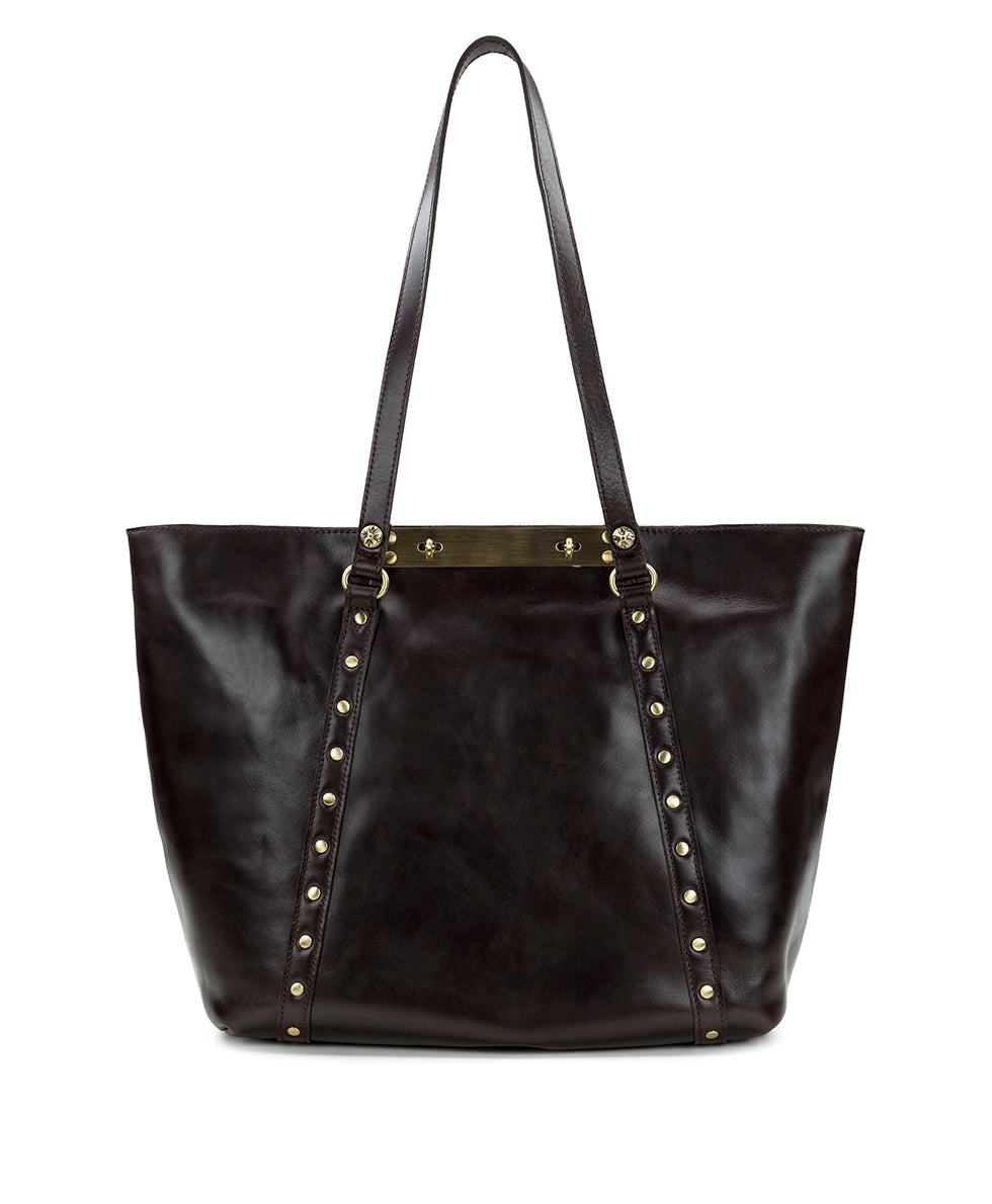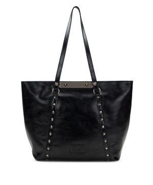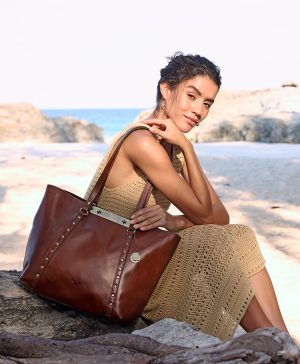 The Benvenuto Tote is the ultimate blend of practicality and signature style. With its bold. spacious design. it’s the perfect tote for every occasion. from busy office days to weekend getaways and evenings on the town. The simple yet sophisticated design features easy over-the-shoulder handles for comfort. stud details that add a touch of edge. and a secure double twist-lock closure to keep your belongings safe. Crafted from full-grain Vintage Distressed Leather. the Benvenuto only gets more beautiful with age. making it a timeless piece that you’ll rely on for years to come.