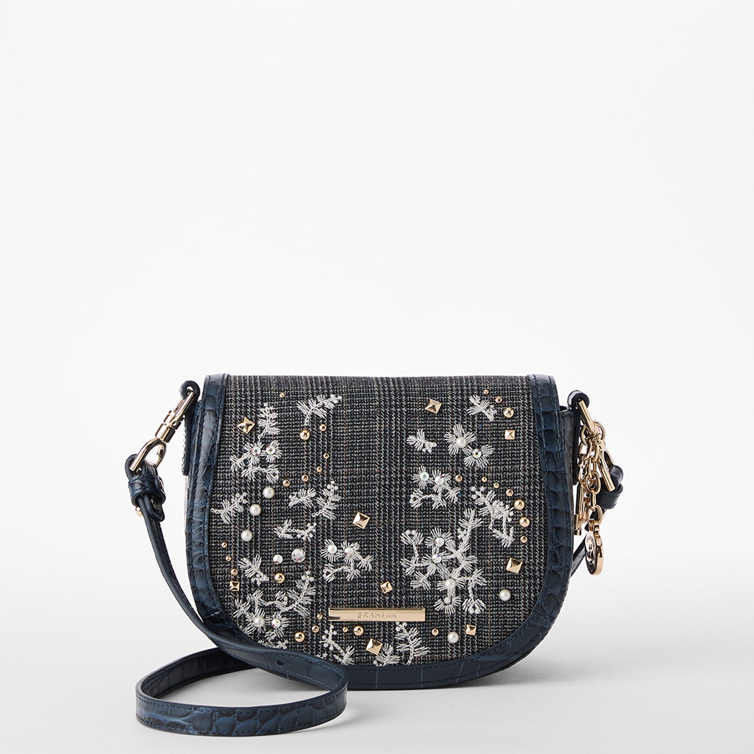 Featured in Multi Riverton. a Premier collection that showcases the best of our elevated craftsmanship. This black plaid fabric embraces the art of the unexpected with delicate floral details and a blue flat croc trim. Swarovski® crystals. pearls. and dome studs bring this to the next level. Select styles feature our medallion charm with a key charm for added personalization. Made with genuine leather.