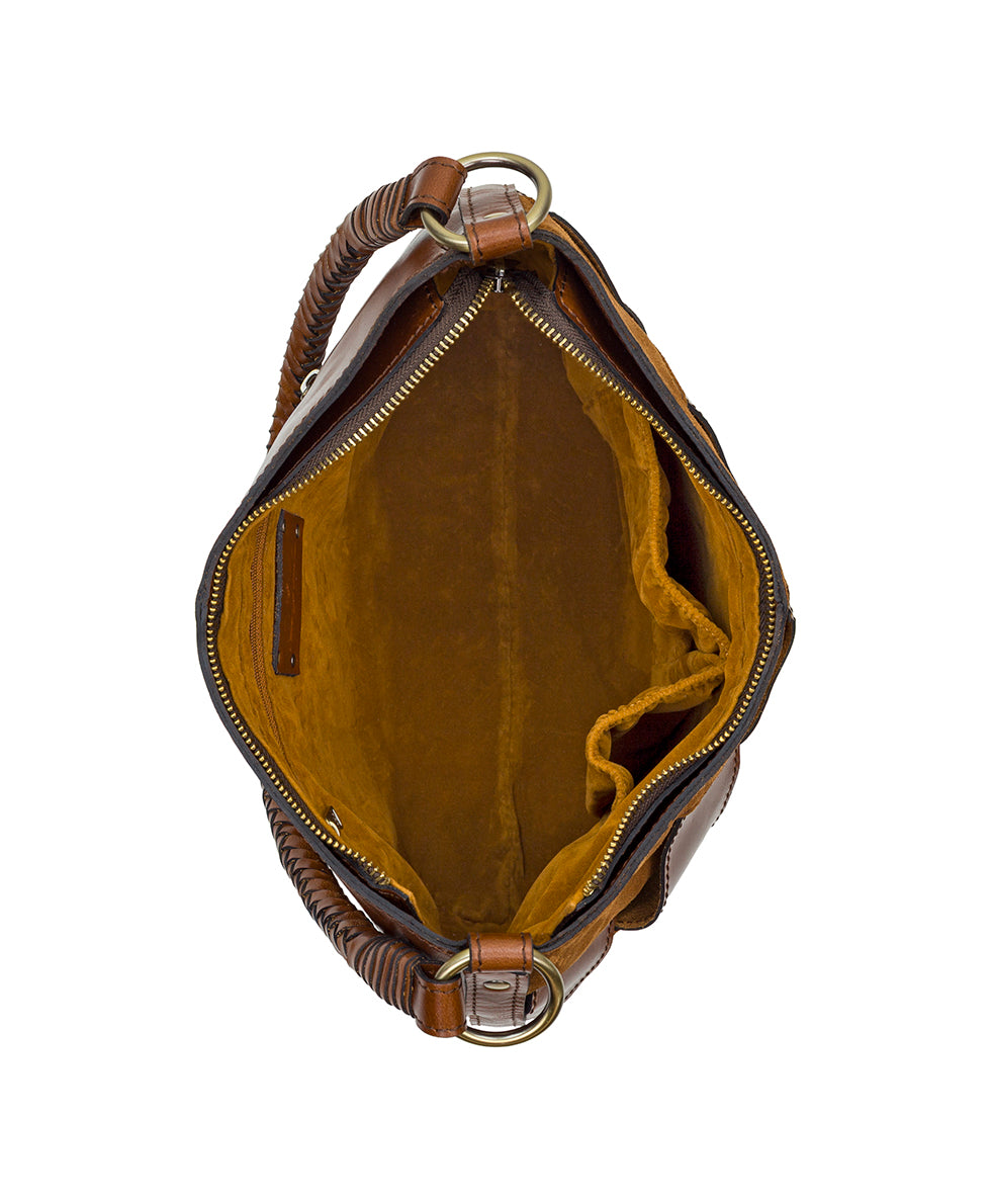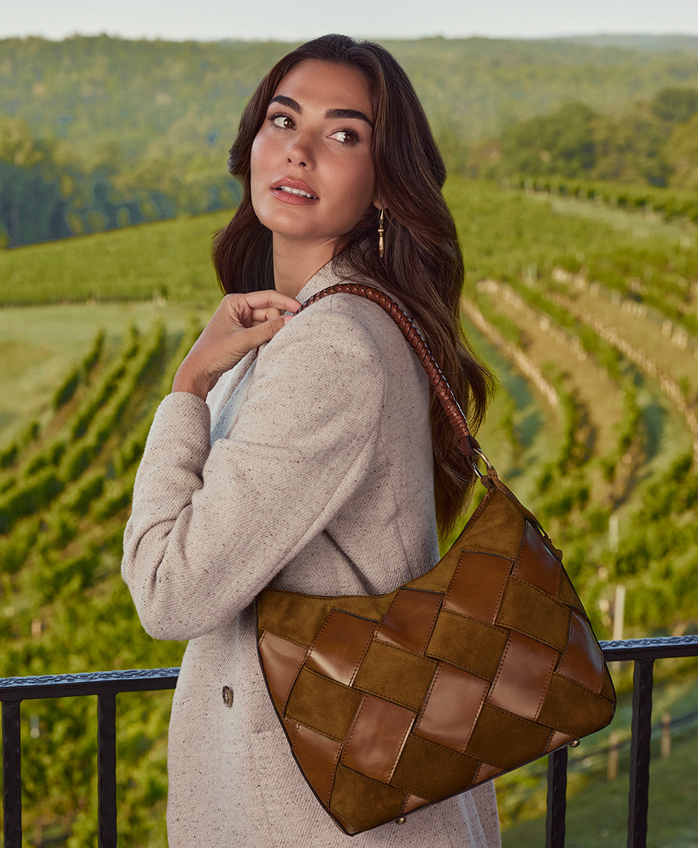 A woven front in luxurious leather lends dimension to this streamlined hobo. A braided rope leather handle. tassels. and signature hardware add to its retro-chic vibes.