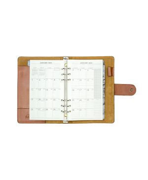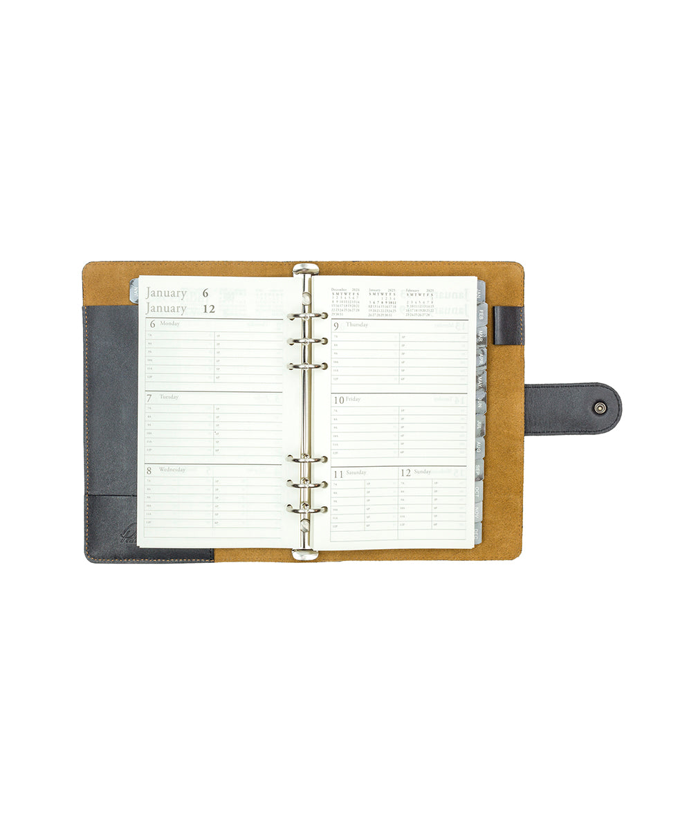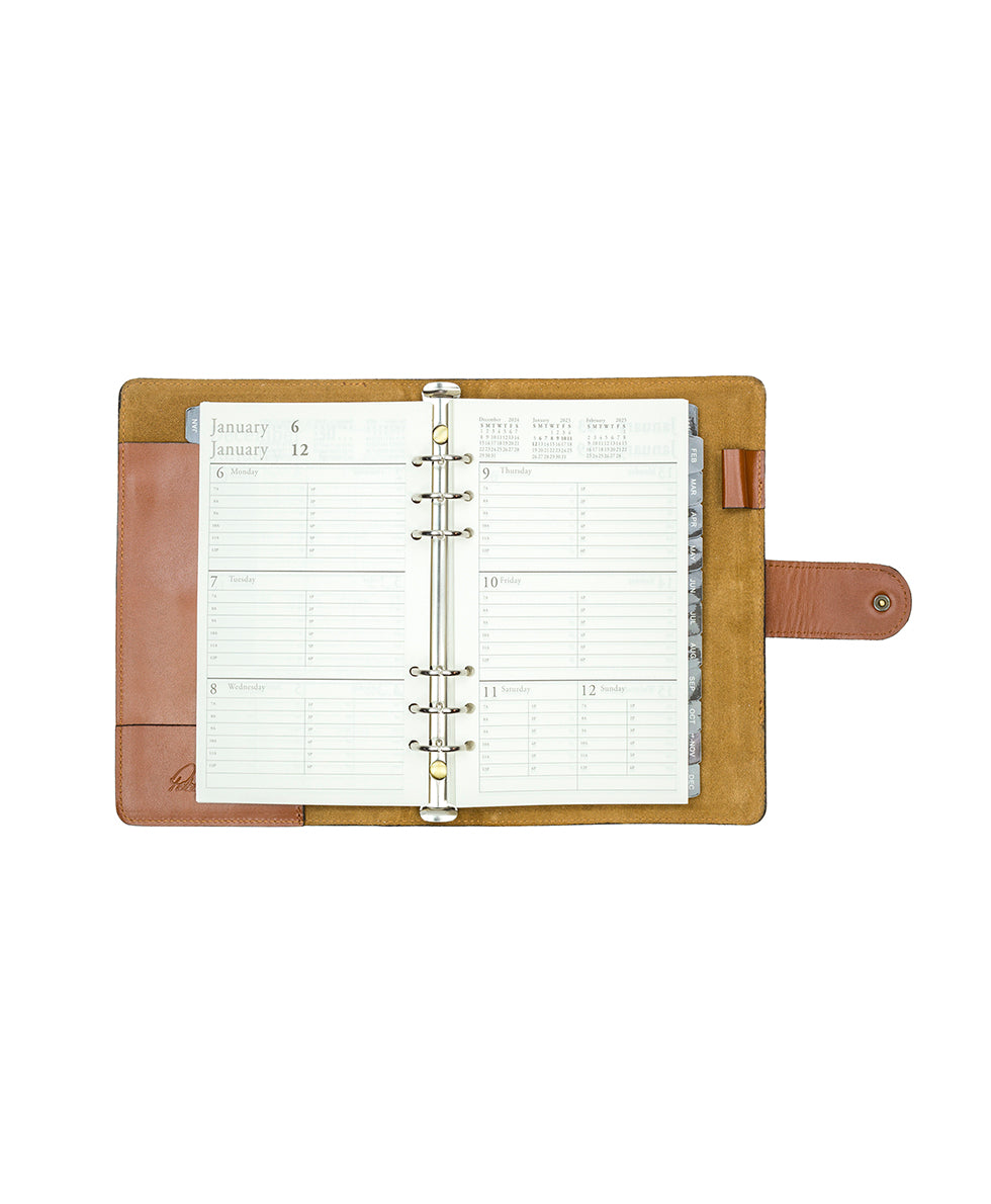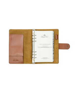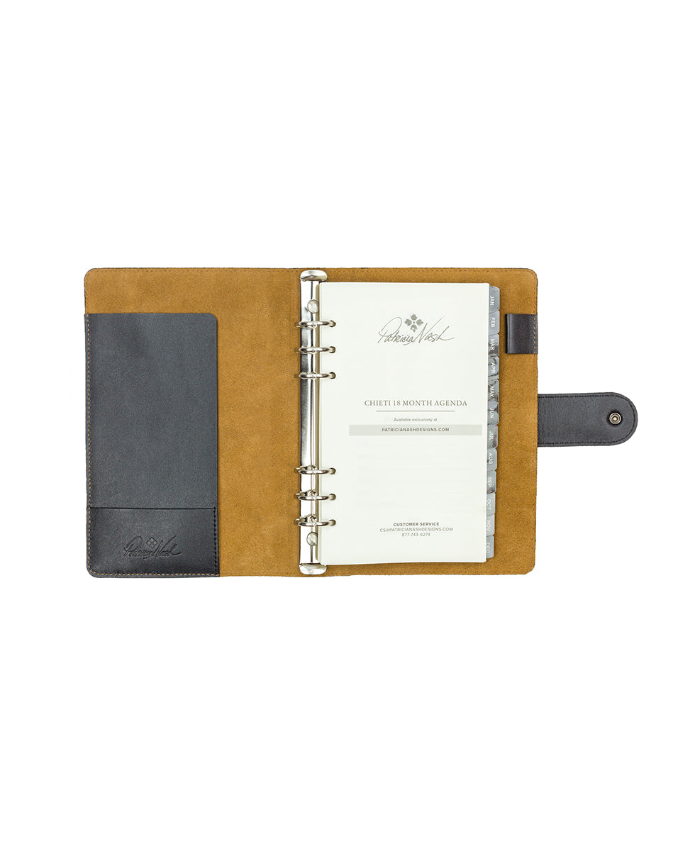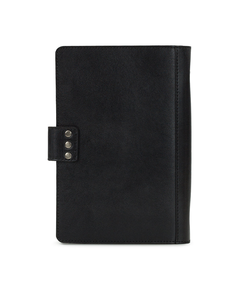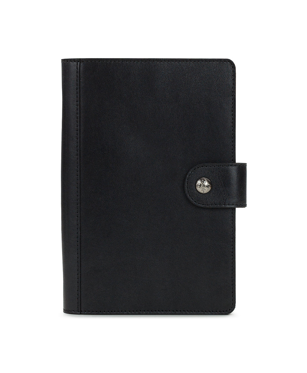 Bring stylish organization to your everyday tasks with this elegant leather organizer. designed to carry on its own or slip into any handbag. pack. or tote. Crafted from supple. durable leather. it keeps your work and personal notes neatly in order. The leather strap. featuring our signature grape leaf floret logo on a signature brushed hardware snap. opens to reveal a six-ring binder. handy pocket. and business card holder.