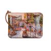 The Corinna is crafted in luxurious leather with a vintage postcard print that adorns the front panel. This gorgeous accessory is a sleek companion for any ensemble and just the right size to carry essentials without weighing you down. Plus. the wrist strap makes it easy to grab and go.
