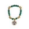 This double chain bracelet features vibrant leather inset charms and metal mementos attached. including our signature grape leaf logo. This unique bracelet is perfect for any occasion and bound to make a statement.