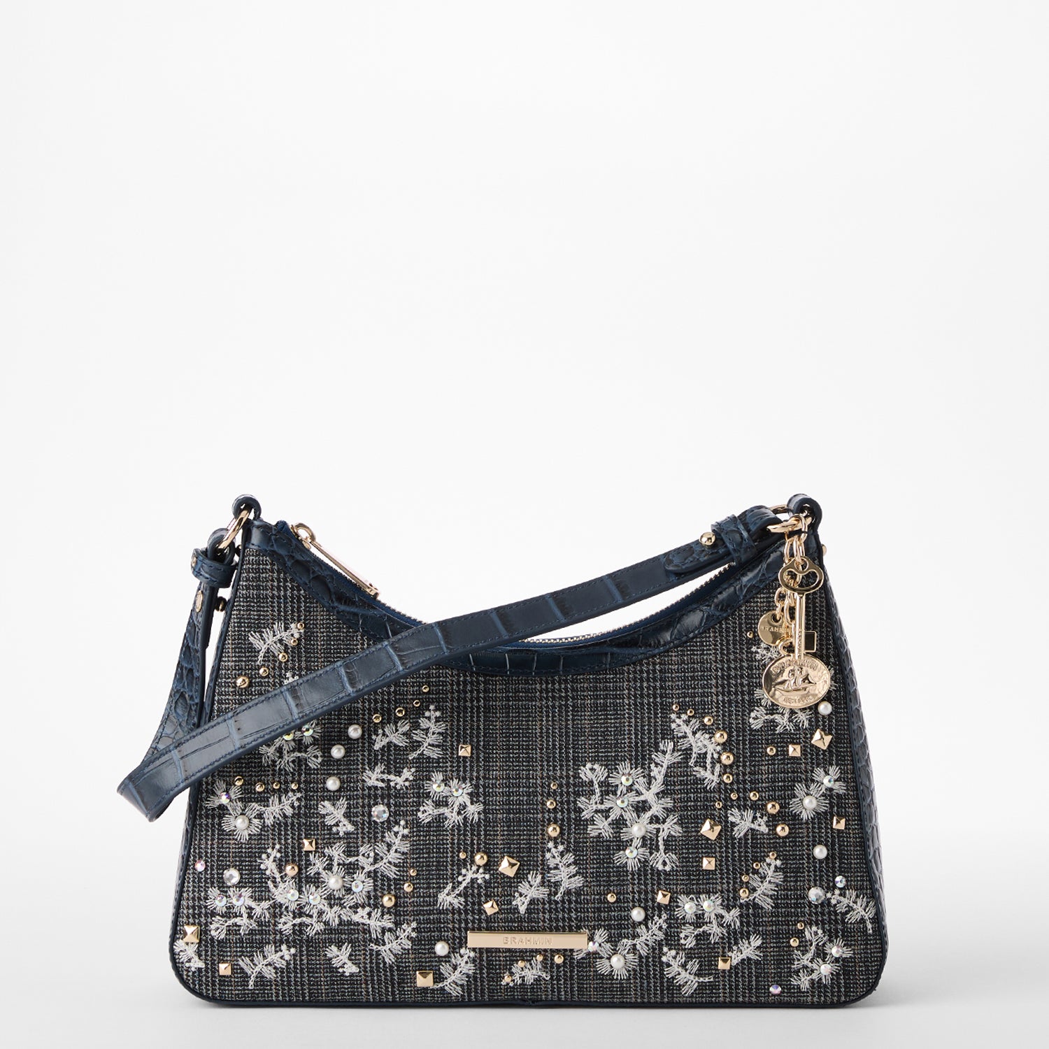 Featured in Multi Riverton. a Premier collection that showcases the best of our elevated craftsmanship. This black plaid fabric embraces the art of the unexpected with delicate floral details and a blue flat croc trim. Swarovski® crystals. pearls. and dome studs bring this to the next level. Select styles feature our medallion charm with a key charm for added personalization. Made with genuine leather.