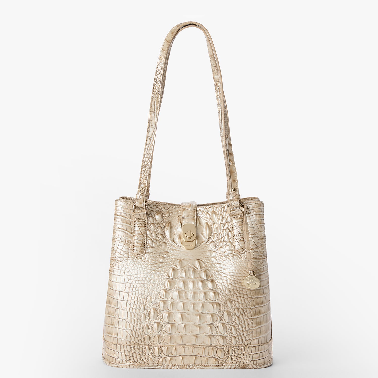 The Fiora is a chic bucket bag inspired by an archival Brahmin style. Reimagined with modern details. this bucket bag features adjustable tote straps that rest comfortably on your shoulder. Various interior compartments provide plenty of storage for your essentials and more. while an exterior back slide-in pocket offers the perfect place to store your phone or other small device. A stylish turn-lock closure adds an elevated touch.