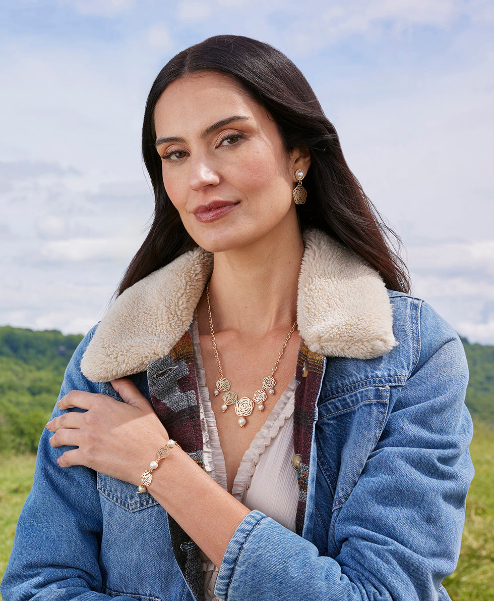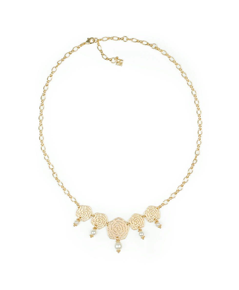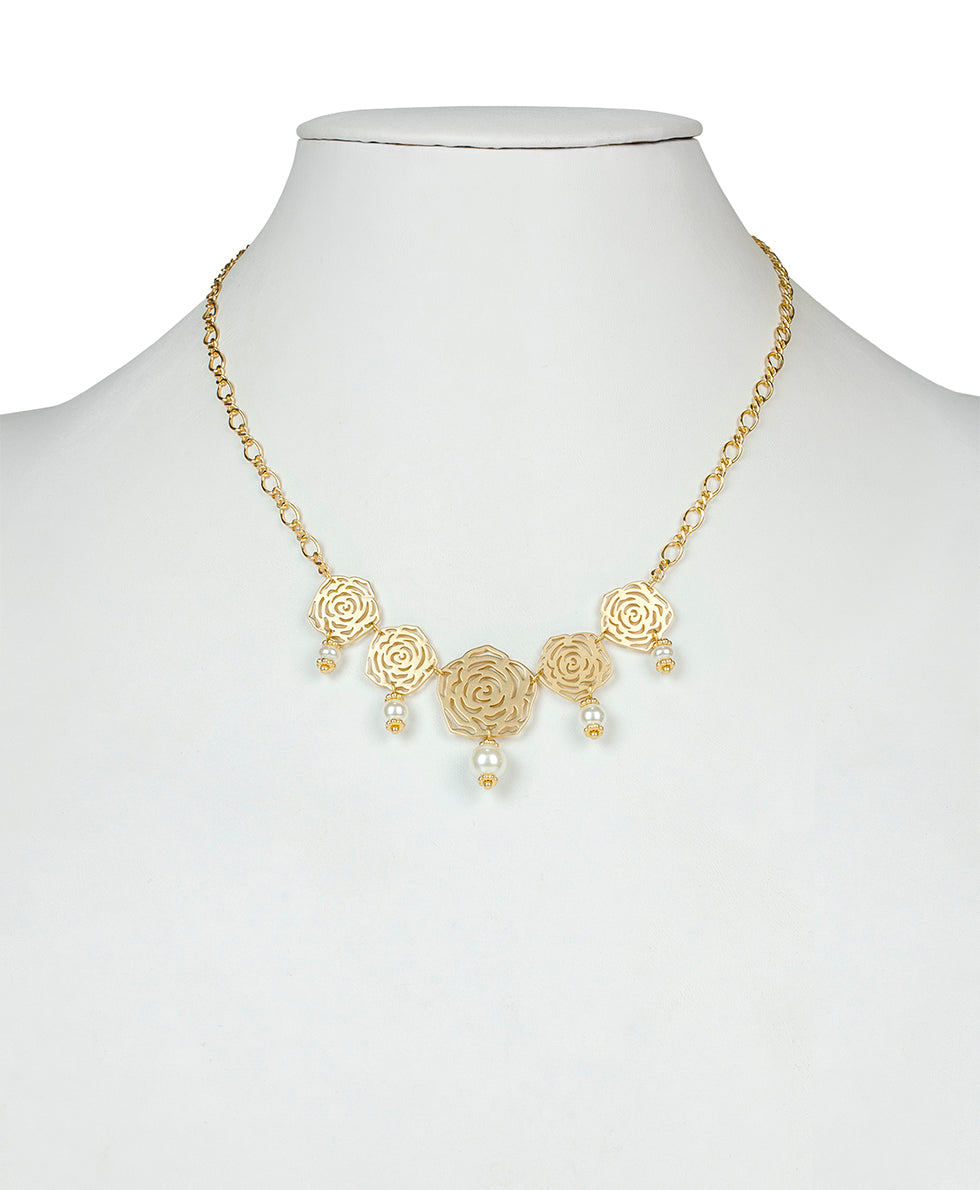 This pretty necklace features beads suspended by laser-cut metal roses for a unique and lovely look.