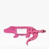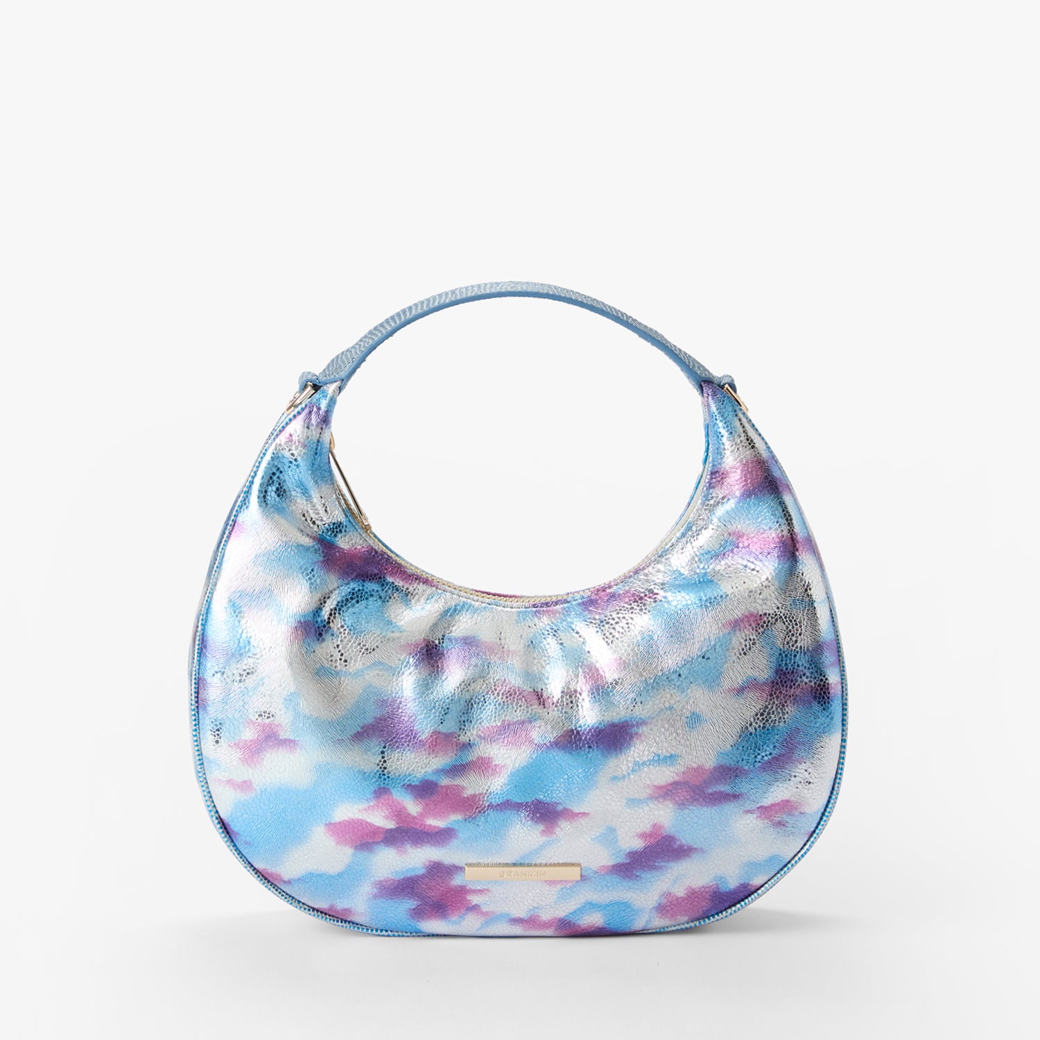 Featured in Multi Durango. a super soft metallic. This showcases our commitment to craftsmanship and unique design. A soft metallic silver leather is embossed with zebra stripes in purples and blues. The matching lizard trim and chunky chain woven through the leather brings a luxe touch. Made with genuine leather.