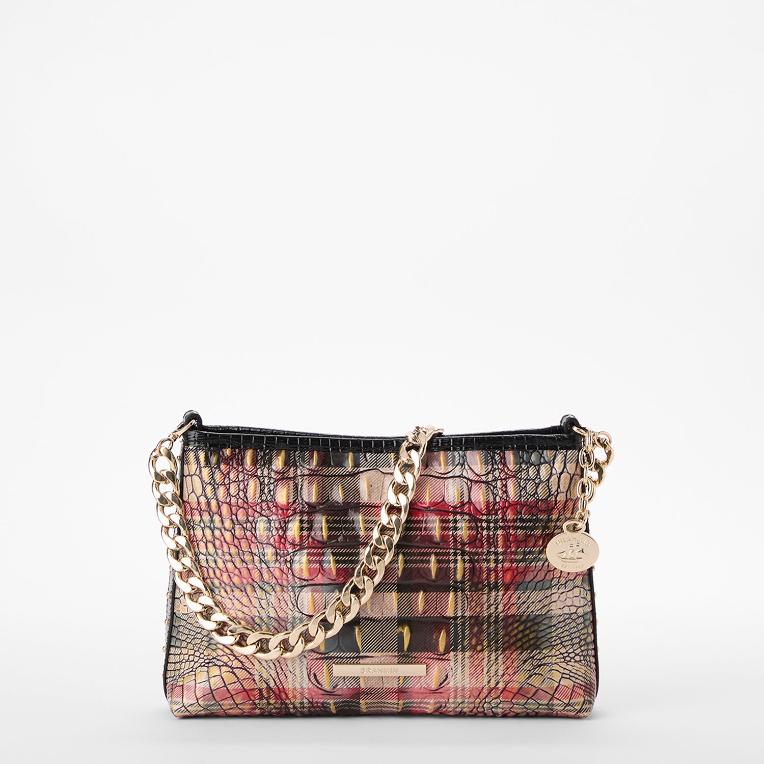 Featured in Multi Merryweather. a warm plaid print. reminiscent of cozy bonfires on autumn nights. The cozy chic of the plaid is reinvented with an unexpected twist. The black lizard trim is enhanced with studded detailing and a chain buckle that gives this an edge. Made with genuine leather.
