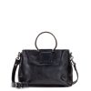 - Exterior: front slip pocket with double turn-lock closure and hanging key clip. rear zip pocket. burned edge finish