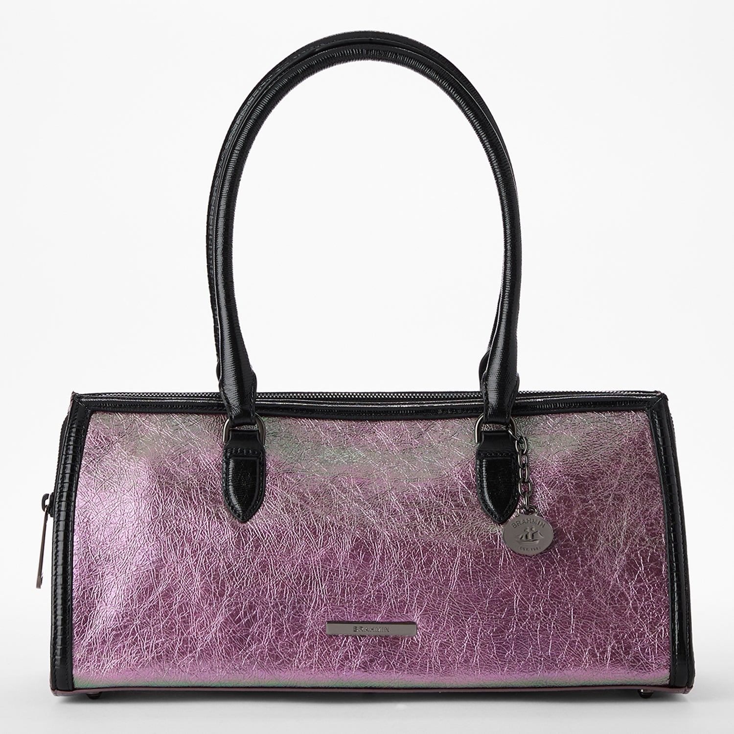 Featured in Heroic Purple Adelaide. a powerful purple metallic. This pretty metallic sparkles in the sunlight to bring elevated interest to any outfit. A smooth leather trim in soft black brings in a grounding element. and graphite hardware infuses this with a modern edge. Made with genuine leather.