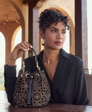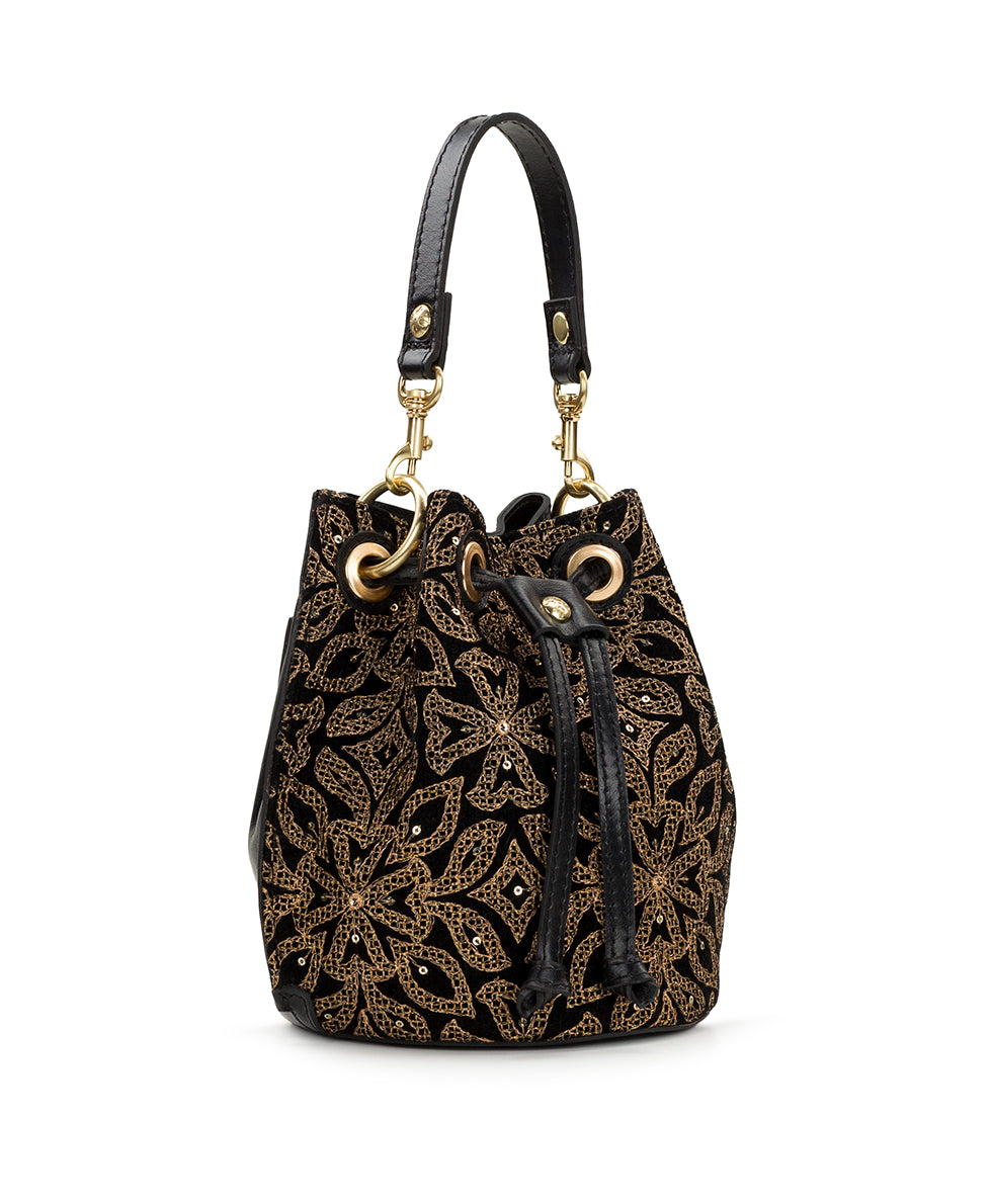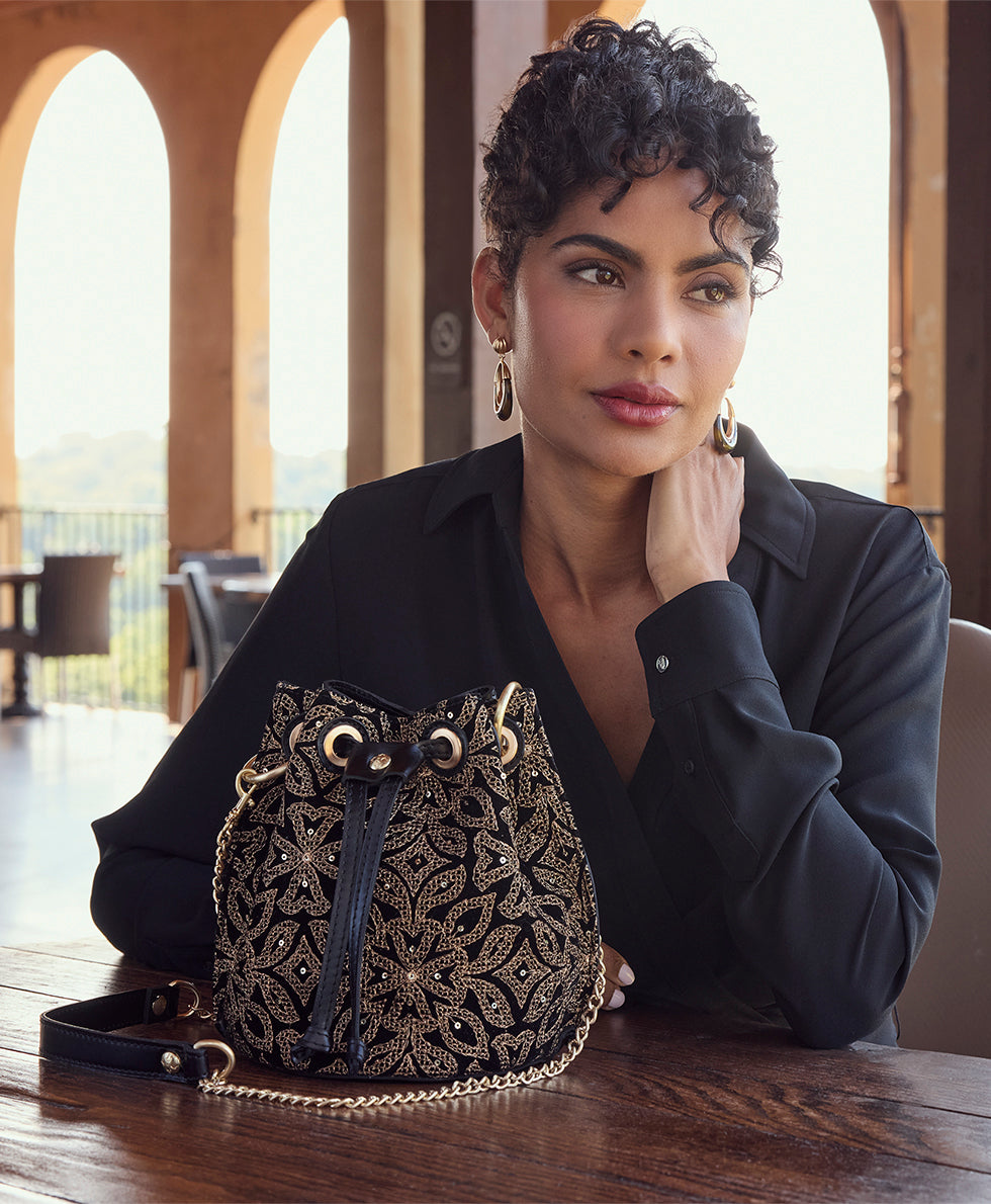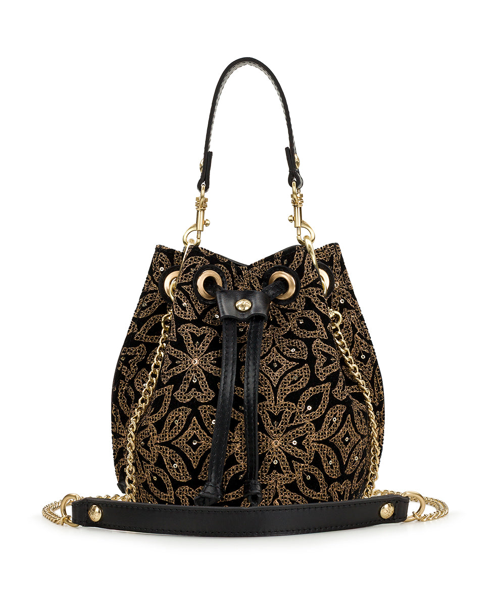 Show your love for vintage fashion with the Volania Drawstring Bag. Crafted in elegant Naoko Velvet. the creative details of this bag ensure it will be an instant classic. Whimsical and totally lovely. it has a round shape. an edgy chain strap that is detachable. as well as a generously sized. detachable top handle. The Volania gives you stylish options.